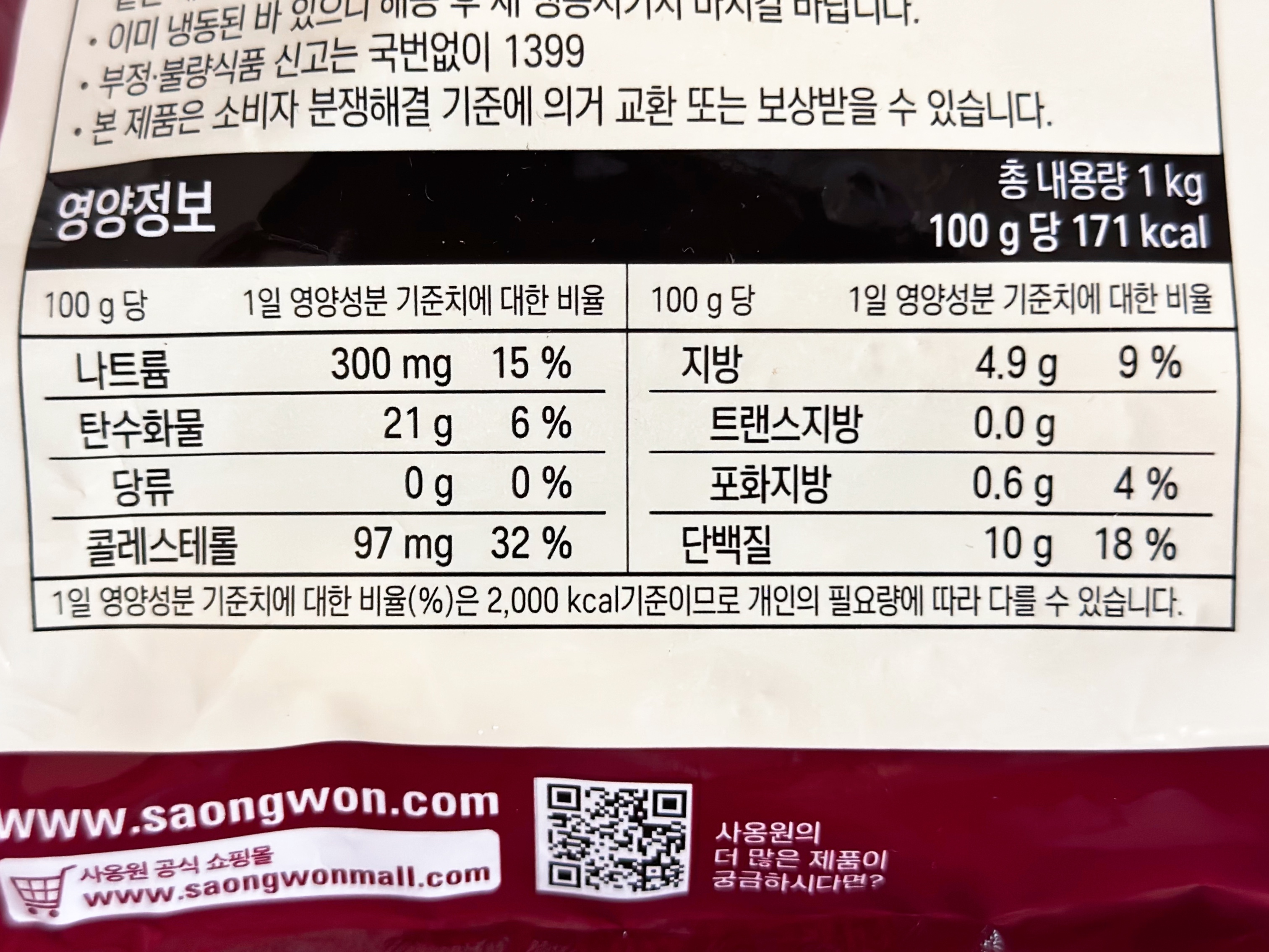 총 내용량은 1kg으로 100g 당 171kcal입니다.