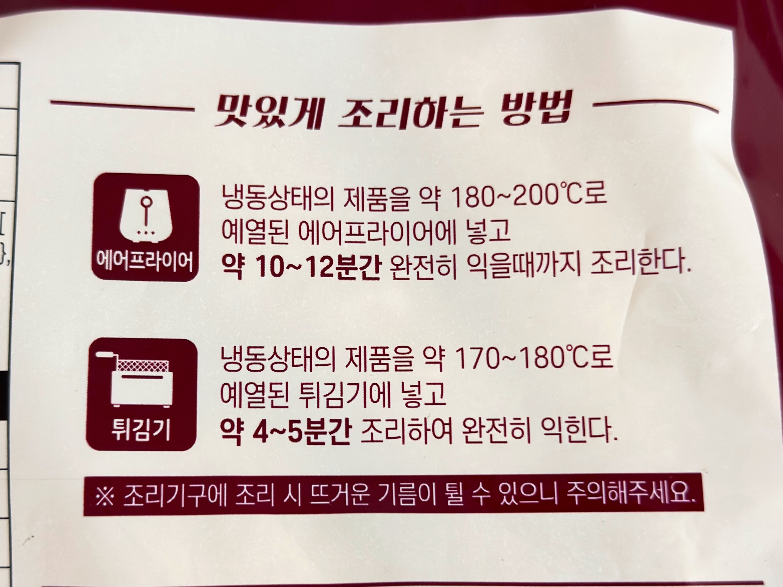 맛있게 조리하는 법으로 냉동상태의 제품을 에어프라이어나 튀김기를 이용하라고 되어있지만