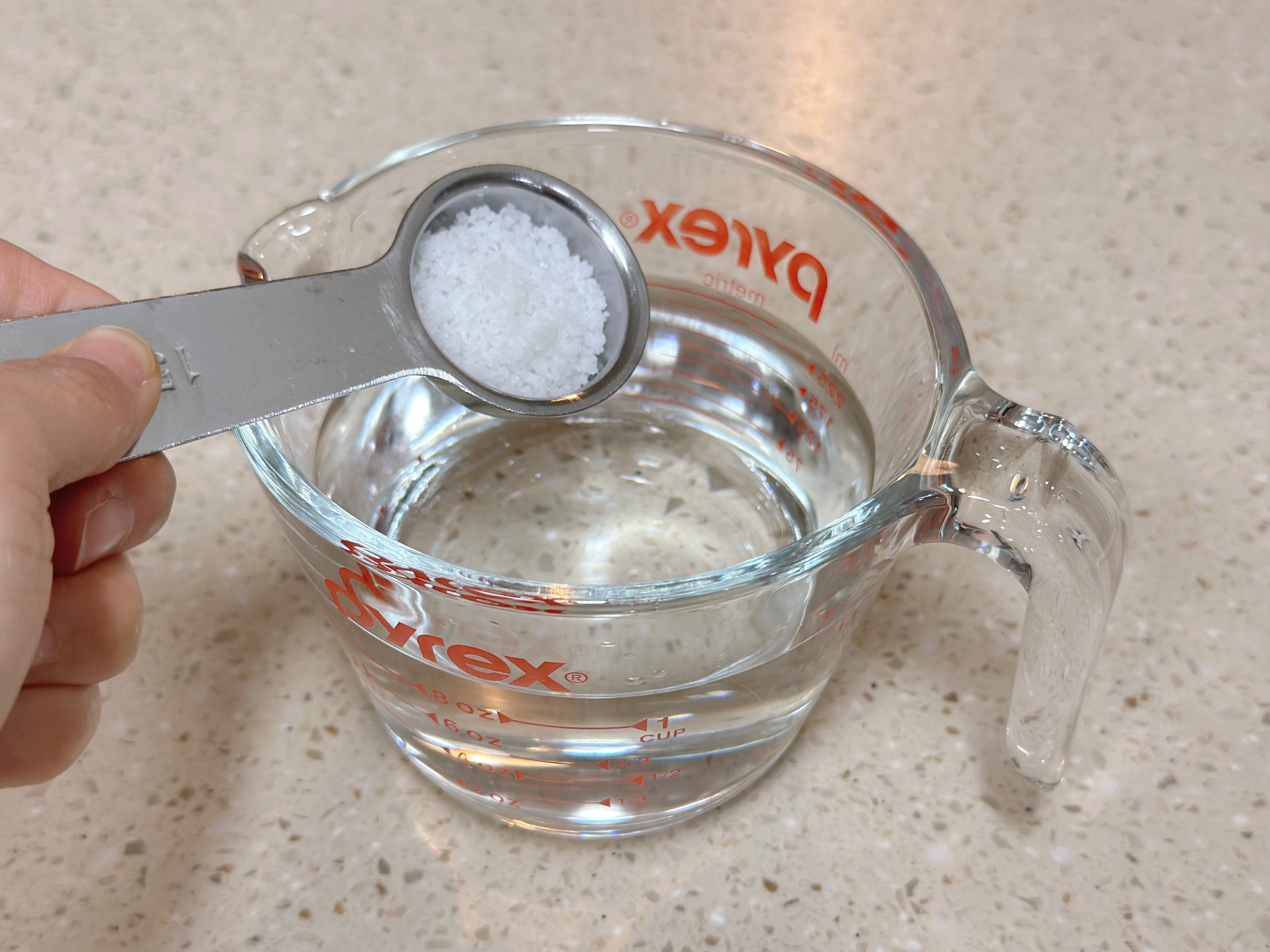 2. 소금 1스푼을 물 200~300ml에 풀어 소금물을 준비합니다.