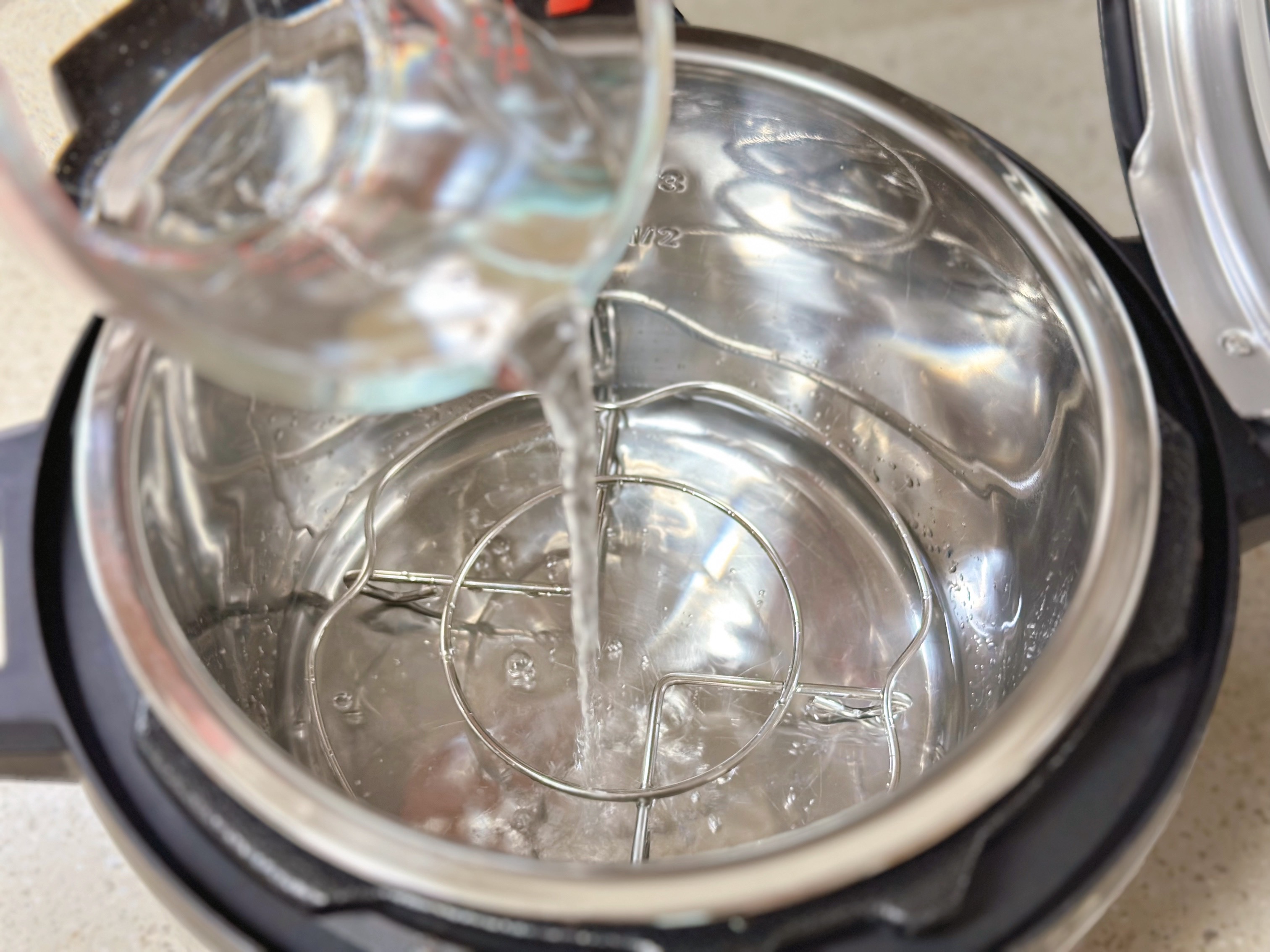 3. 인스턴트팟에 스텐 찜기 채망을 넣고 망이 잠기지 않을 만큼 소금물을 부어 준 후, 그 위에 계란을 깨지지 않게 조심해서 하나씩 쌓아주세요.